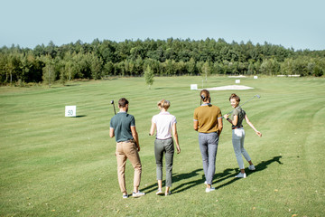 Young and elegant friends walking with golf equipment while playing golf on the beautiful course on a sunny day, view from the backside