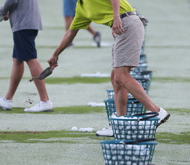 A golfer fills in a divot with sand after hitting balls at a practice facility.
