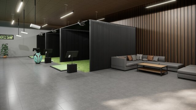 Futuristic indoor golf sumulator. A modern interior with a golf field