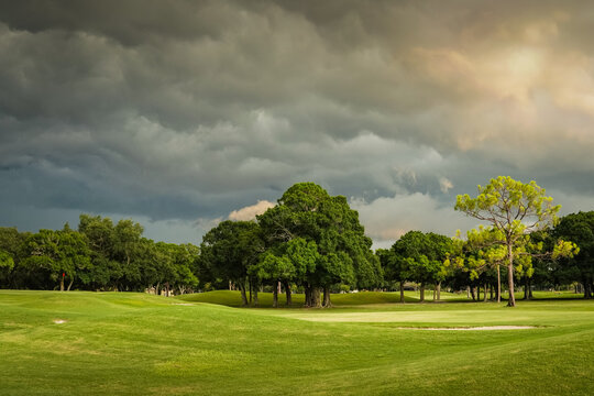 Luxury golf green vista, backlit palm trees, emerald putting surface, evening sunburst, perfect lawn texture, tropical course design, golden hour shadows, sport facility photography, serene