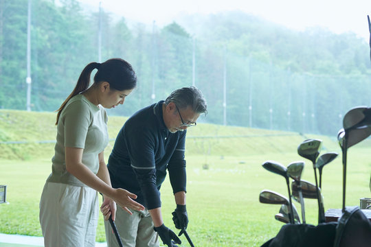 Athletic woman trainer teaches teenage girl child to play golf concept