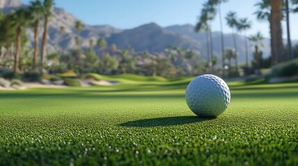 Golf ball close-up on sunny course with typography overlay