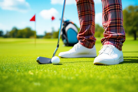 Golf player focusing on putting on a sunny course, plaid pants and white shoes, green grass background, concept of focus and leisure. Ai generative