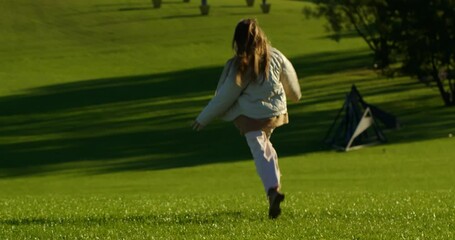 beautiful blonde girl with flowing hair in light clothes and a jacket is running on a green grass lawn at sunset. a woman joyfully runs on the golf course.