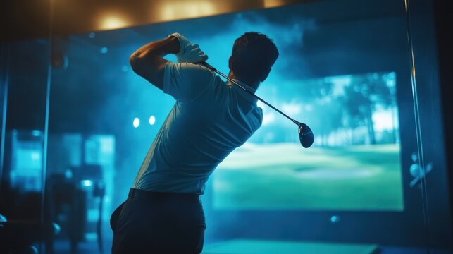 professional male golfer playing golf indoors in a golf simulator with a training field screen.