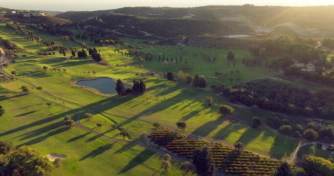 Aerial view of golf courses in a beautiful landscape. Outdoor sports games. High quality 4k footage