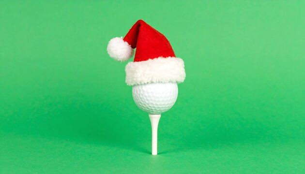 Festive golf concept for the Christmas holidays. A golf ball wearing a Santa hat sits on a tee against a bright green background.