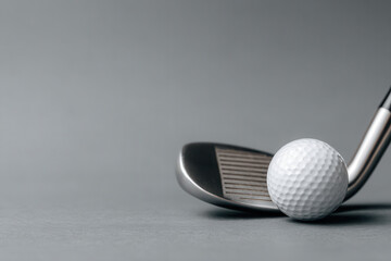Golf club rests beside a white golf ball on a smooth gray surface during a practice session