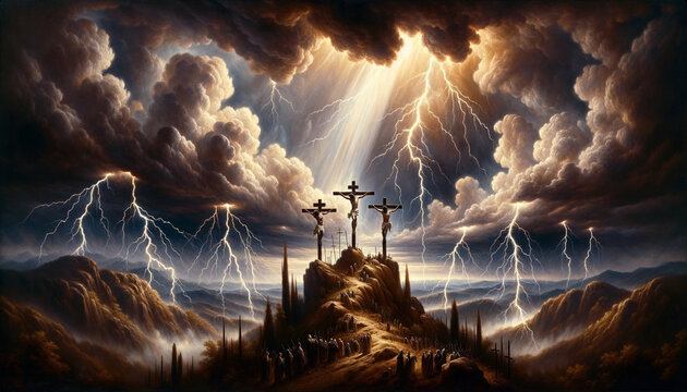 Electrified Crucifixion as Golgotha's Drama Unfolds: Divine Illumination of the death of Jesus Christ on the Cross between two Criminals amidst Dramatic Lightning, Dark Clouds, and Golden Sun Rays.
