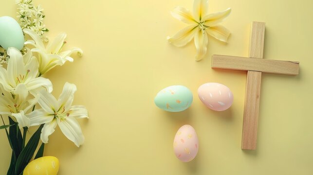 Easter themed flat lay with wooden cross painted eggs and lily flowers on a light yellow backdrop Room for adding text