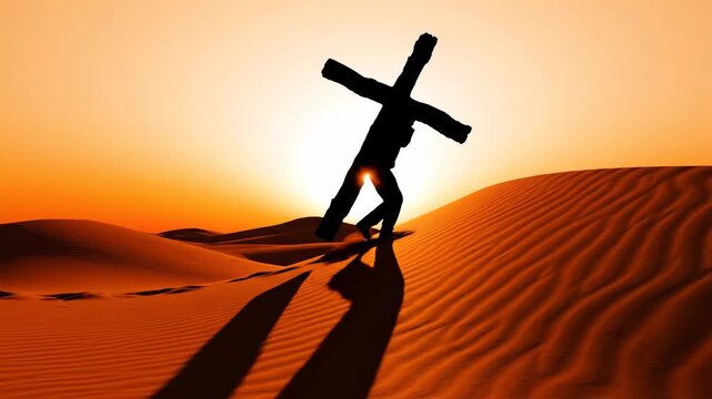 Silhouette of a man carrying cross up a desert dune during sunrise, symbolizing religious devotion and struggle for spirituality
