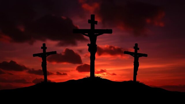 Three crosses on a hill silhouetted against a time-lapse sunrise. The crucifixion of Jesus Christ representing faith, hope, and resurrection. Christian Easter and Good Friday concept