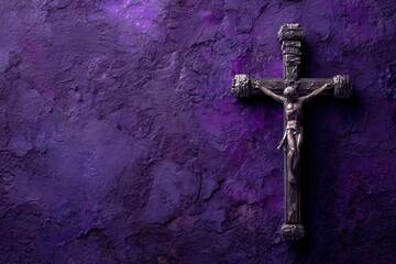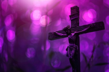 Lent Purple Background. Religious Easter Design with Church Elements and Jesus Christ Crucifix