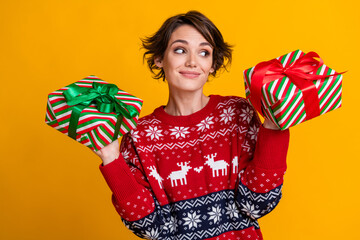 Portrait of good mood woman with stylish hairdo wear ornament sweater hold two gift boxes on xmas isolated on yellow color background