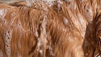 Close-up of golden fur being thoroughly washed with shampoo and water, creating abundant suds during a refreshing pet bath session at home, showcasing animal hygiene and care