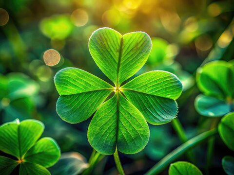 Four leaf clover stands out from green clovers. Rare lucky find for St Patricks Day. Symbolizes good luck fortune, prosperity. Ideal for wishes or St Patrick Day charm.