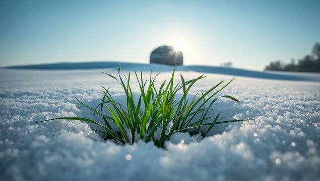 Snow-covered golf course with emerging grass and a distant bush, emphasizing seasonal change, Hello spring, Goodbye winter