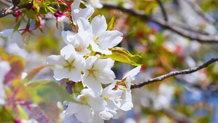 春、晴れた日に、満開で風に揺られる一房の桜