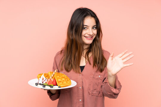 Young caucasian woman holding waffles isolated on pink background saluting with hand with happy expression