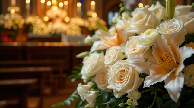 White roses and lilies at a solemn funeral ceremony in a church.