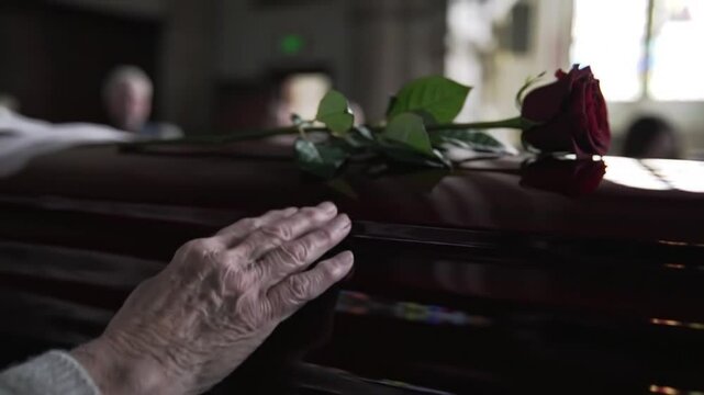Coffin, flower and hands of person at funeral for goodbye with grief, loss or pain of mourning closeup. Sad, death and rose for respect with widow in church for farewell ceremony or memorial service
