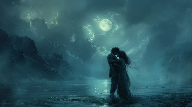 Embracing tearfully under the moonlit sky before a perilous journey.