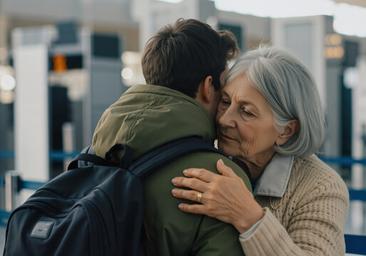 Emotional farewell hug between a senior woman and her grandson at the airport, expressing love and support before departure