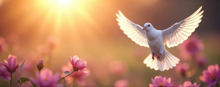 A single white dove taking flight against a softly blurred background of flowers and a gentle sunrise, symbolizing hope and peace after loss , comfort, soul