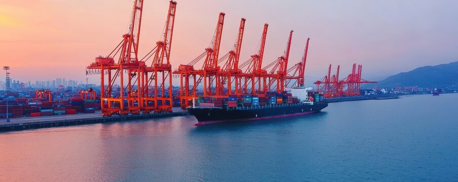A vibrant harbor scene at sunset, showcasing large cranes and a cargo ship docked by the water's edge.