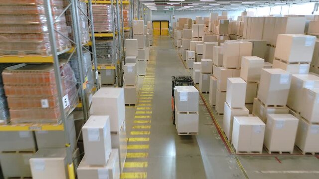 Busy warehouse with stacked boxes and a forklift navigating through aisles during the day