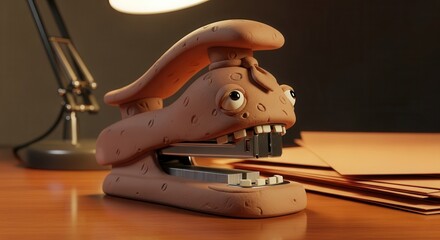 Playful claymation style office tool exhibits a goofy expression upon a wooden desktop
