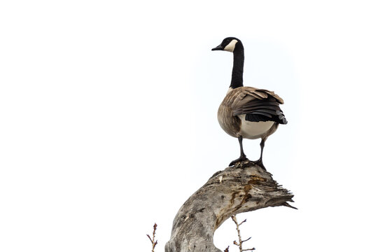 Canada Goose (Branta canadensis) bird perched up on a tree trunk isolated on white background. Wildlife animal photography with copy space