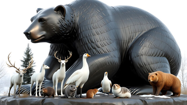 Metallic 3D image of huge bronze sculpture of giant black bear sitting. animals of regular size are sitting in his hands and feet. these animals include a white tale deer, racoon, Generative AI