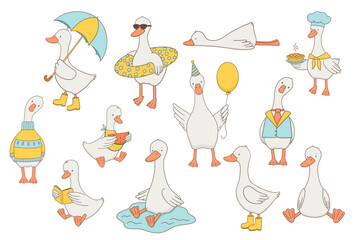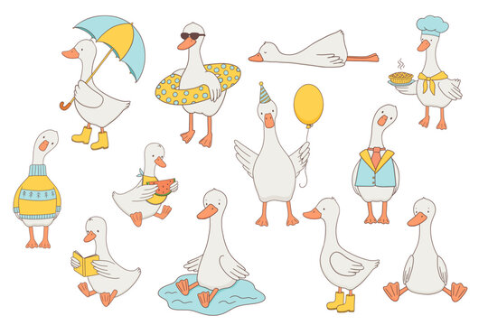 Cute cartoon goose characters set, sitting animal in puddle, beach, with watermelon, hand drawn illustration for kids. Bird in sweater, chef hat, and birthday balloon.