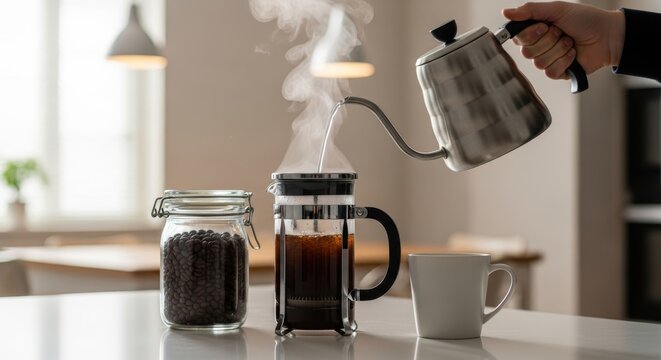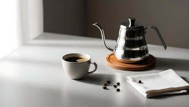 Morning Brew Ritual: A stainless steel gooseneck kettle and a cup of coffee grace a sunlit countertop, alongside coffee beans and a pristine napkin.