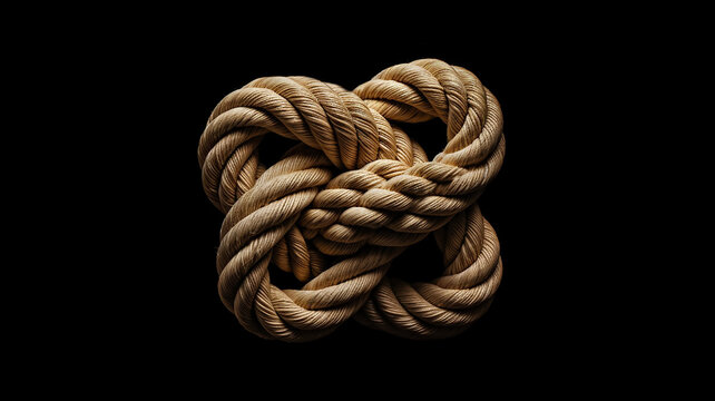 Closeup of a complicated, undetachable knot of hemp rope against a dark background