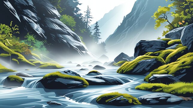 Stylized river winding through a misty mountain valley with lush green moss and trees on dark rocks light in the distance