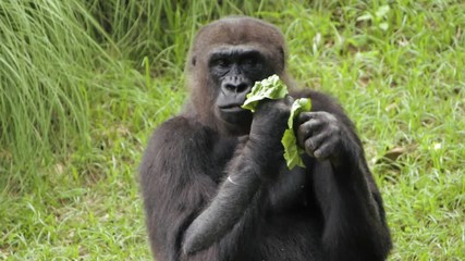 Medium shot of a gorilla sitting in a field of grass eating foliage. Occasionally looks in the direction of the camera and brushes food on hand.