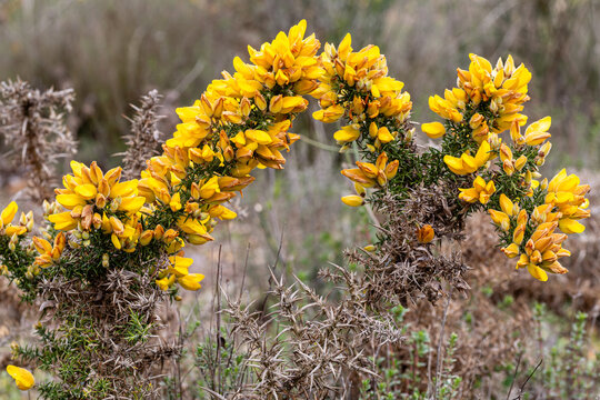 Ulex europaeus. Thorny gorse bush with yellow flowers.