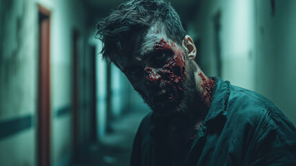 A man with a bloody face is standing in a hallway. The image has a creepy and unsettling mood, as the man's appearance is gory and disturbing
