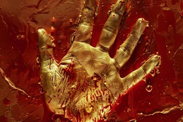 A single, vivid red handprint with blood trails against a grey backdrop. Captures the essence of a horror story or a crime scene investigation. AI generation AI generation
