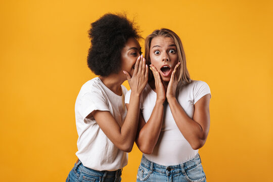 Senior Caucasian women gossiping about husbands standing indoors talking. Curious elderly lady listening friend whispering on ear sharing rumors. Femininity and eternal friendship