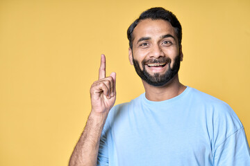 Happy smart excited indian ethnic bearded casual man pointing finger up got new great idea, eureka concept, feeling inspired by realizing finding solution isolated on yellow background.