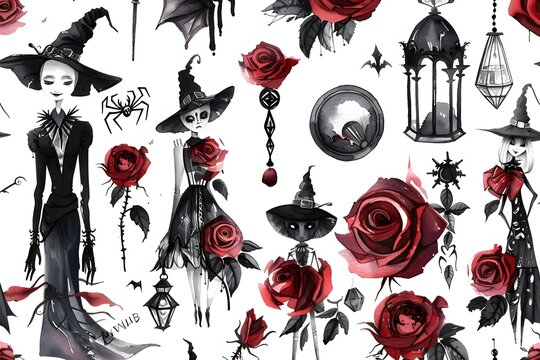 Gothic fantasy clipart set, watercolor style with gothic elements on white background