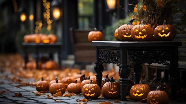 Joyful family enjoying autumn leaves with thanksgiving decor