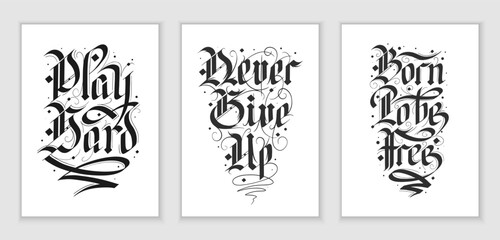 Gothic. Uppercase and lowercase black letters on a white background. Beautiful and stylish calligraphy. Elegant font for tattoo. Medieval European modern style. The letters are written with a pen.