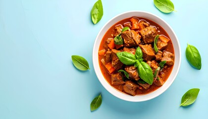 Beef goulash in a bowl on a blue background