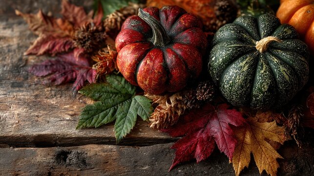 Autumn gourds and leaves on rustic wood (1)