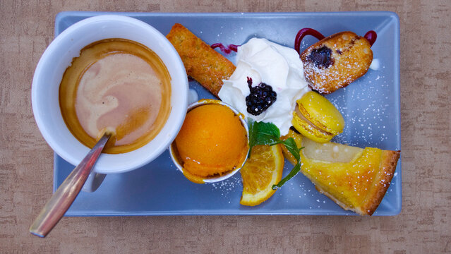 Présentation de café gourmand avec expresso et mignardises sucrées