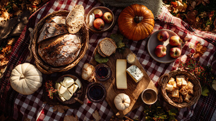 Delicious autumn picnic spread featuring cheese, bread, and apples on a red and white blanket.